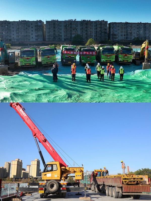 建設(shè)現(xiàn)場,機械引擎轟鳴,鉆機高聳入云,運輸車輛整齊劃一,全員蓄勢待發(fā)。