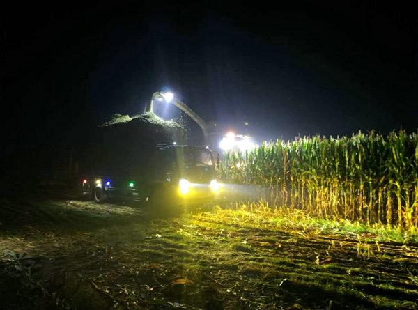 青貯作業(yè)地塊大、時間緊,搶收同樣面臨挑戰(zhàn)。為趕在雨歇窗口期完成搶收,豐安團隊決定晝夜不息、連續(xù)作戰(zhàn),實行全天候輪班。劉佳天不亮就帶頭下地,劉磊、高朋、王繼唯深夜在田間協調機械、清理地塊,大家餓了就在田埂上扒幾口盒飯,困了就在駕駛室里輪流瞇一會兒,忙到凌晨三點結束工作。與此同時,王立威、張紅同樣全力以赴,從清晨6點持續(xù)奮戰(zhàn)至次日凌晨2點,不停地過磅統計,收款調度,期間經手車輛達1000余輛,確保運輸有序、賬目清晰。