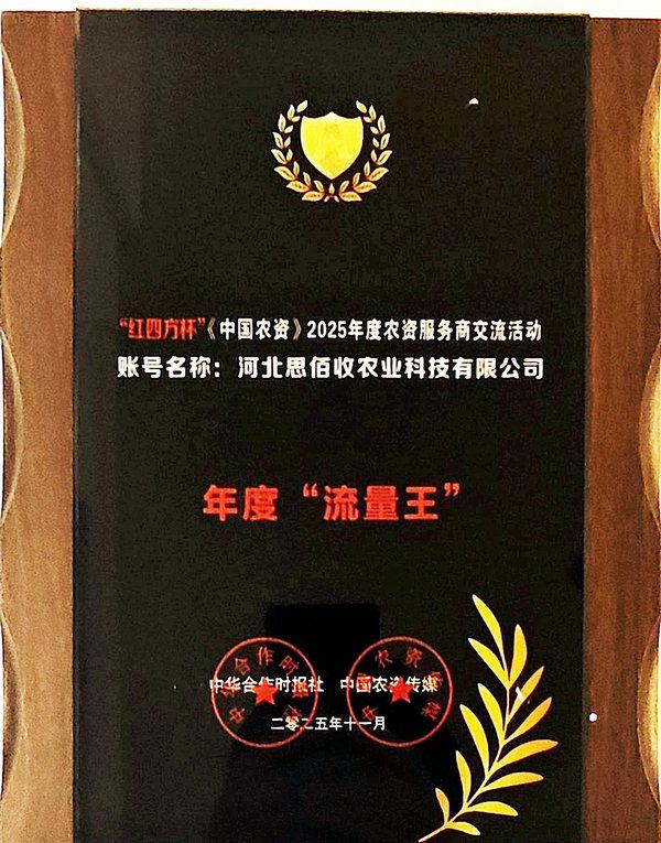 ? 同日,由中華合作時報社、中國農(nóng)資傳媒主辦的“‘紅四方杯’尋找流量王 ·《中國農(nóng)資》2025年度農(nóng)資服務(wù)商交流活動暨《國肥之光第二季》”在南京舉行。會上發(fā)布了2024-2025年度農(nóng)資服務(wù)商典范企業(yè)名單及年度“流量王”名單,集團公司榮獲“農(nóng)資保供典范企業(yè)”榮譽稱號,旗下河北思佰收農(nóng)業(yè)科技有限公司視頻號榮獲年度“流量王”榮譽稱號。